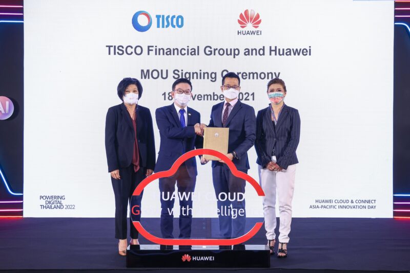 คุณอาเบล เติ้ง (ที่สามจากซ้าย) ประธานกรรมการบริหาร บริษัท หัวเว่ย เทคโนโลยี่ (ประเทศไทย) จำกัด ร่วมลงนามในบันทึกข้อตกลงด้านการพัฒนาเทคโนโลยีด้าน EI (Enterprise Intelligence) และบริการคลาวด์ด้าน Machine Learning โดยมีคุณวันธนา โชติชัยสถิตย์ (ซ้ายสุด) ผู้ช่วยกรรมการผู้จัดการใหญ่ สายงานเทคโนโลยีสารสนเทศ ธนาคารทิสโก้ จำกัด (มหาชน) และคุณปิยะธิดา อิทธิระวิวงศ์ (ขวาสุด) ประธานกรรมการแผนกธุรกิจคลาวด์ ประเทศไทย บริษัท หัวเว่ย เทคโนโลยี่ (ประเทศไทย) จำกัด ร่วมเป็นสักขีพยาน