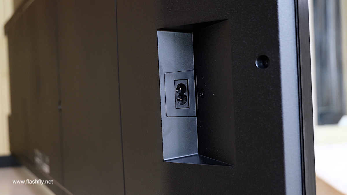 มุมมองด้านข้างจะเห็นส่วนกรอบจอที่บางเพียง 9.9 มิลลิเมตร แต่ส่วนที่หนาที่สุดอยู่ที่ 72.1 มิลลิเมตร ซึ่งเป็นพื้นที่ของพอร์ตเชื่อมต่อต่างๆ ได้แก่ HDMI 2.0 (3 ช่อง), AV, USB 3.0 และ SPDIF อีกด้านจะมีช่องสำหรับเสียบสายไฟ