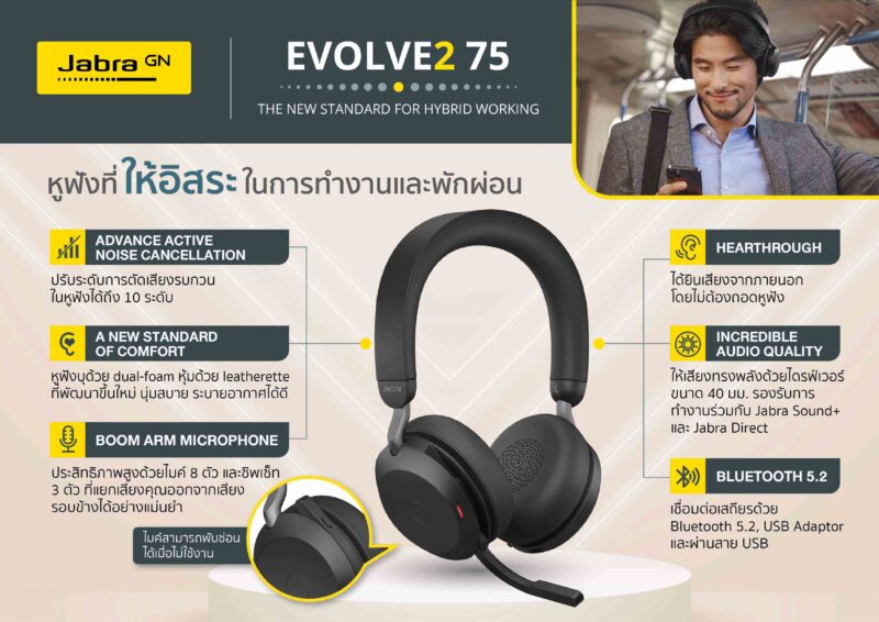 สำหรับ Jabra Evolve2 75 เป็นหูฟังไร้สายแบบครอบหูระดับพรีเมี่ยมของตระกูล Evolve ที่ออกแบบมาเป็นพิเศษเพื่อการทำงานจากต่างที่ได้ที่ไหนก็ไหนอย่างสะดวกสบายและให้ประสิทธิภาพที่ดียิ่งขึ้น ด้วยเทคโนโลยีตัดเสียงระบบแบบรบกวน Active Noise Cancellation  (ANC) ที่สามารถปรับระดับเสียงรอบข้างได้ตามต้องการ ทำให้เสียงมีความคมชัดกว่าหูฟังรุ่น Evolve เดิมถึง 26% จึงช่วยสร้างสมาธิในการทำงานมากขึ้น รวมถึงมีฟังก์ชั่น HearThrough ที่ทำให้ได้ยินเสียงจากภายนอกโดยไม่ต้องถอดหูฟังให้เสียเวลา ช่วยให้ไม่พลาดการติดต่อประสานงานในที่ทำงาน และปลอดภัยเมื่ออยู่ภายนอก