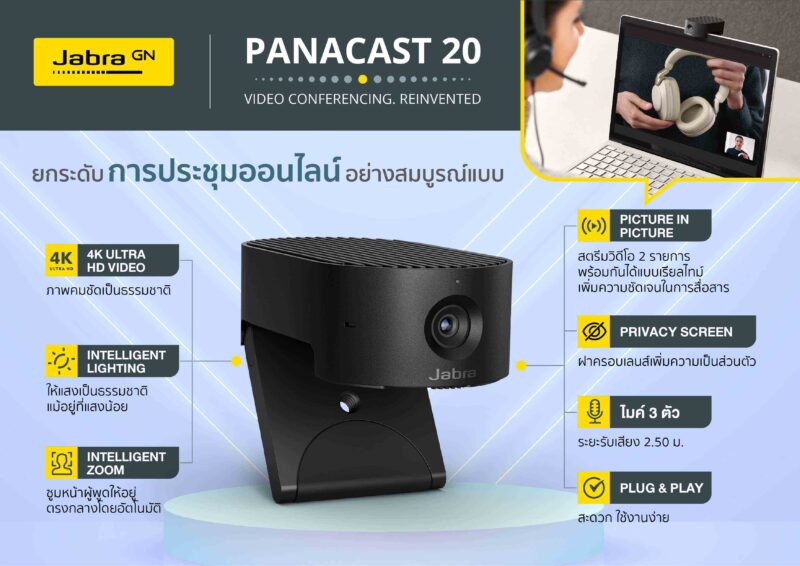 ขณะที่ Jabra PanaCast 20 เป็นกล้องวิดีโอคอนเฟอร์เรนซ์อัจฉริยะระดับพรีเมี่ยมที่ออกแบบมาเพื่อยกระดับประสบการณ์ในการประชุมออนไลน์แบบส่วนตัวอย่างสมบูรณ์แบบและให้ความปลอดภัยอย่างมาก ด้วยสุดยอดระบบประมวลผลภาพอันทรงพลัง พร้อมด้วย AI ตรวจจับภาพอัตโนมัติ และเทคโนโลยีบันทึกภาพในให้ภาพคมชัดด้วยความละเอียดระดับ 4k ที่มีความละเอียด 13 เมกกะพิกเซล เพื่อให้สามารถจับภาพได้อย่างรวดเร็ว และคมชัด ทั้งยังมาพร้อมระบบซูมอัจฉริยะที่ขับเคลื่อนด้วย AI ที่จะช่วยซูมภาพผู้พูดระหว่างประชุมให้อยู่ตรงกลางและเหมาะสมที่สุดโดยอัตโนมัติไม่ว่าจะนั่งอยู่มุมใดในห้อง ขณะเดียวกันยังให้แสงที่เป็นธรรมชาติและคมชัดมากขึ้นไม่ว่าคุณจะนั่งทำงานอยู่ที่ใดก็ตาม หรือแม้กระทั่งในที่แสงน้อย ด้วย Intelligent Lighting จึงทำให้รู้สึกเหมือนทุกคนนั่งอยู่ในห้องเดียวกัน นอกจากนี้ ยังมีโหมด Picture in Picture ทำงานเพื่อฉายวิดีโอแบบซูม และภาพกว้างพร้อมกันแบบเรียลไทม์ เหมือนมีกล้องสองตัว ที่สำคัญยังมาพร้อมฝาครอบปิดเลนส์ และระบบประมวลผลข้อมูลจาก AI ในตัวกล้องเอง จึงมั่นใจได้ว่าสามารถป้องกันการละเมิดข้อมูลได้สูงสุด ทั้งยังรองรับการใช้งานได้กับแพลตฟอร์ม UC ชั้นนำ แถมใช้งานง่ายด้วยระบบ Plug and Play ที่สามารถติดตั้งได้หลากหลายรูปแบบ เพื่อให้ได้มุมกล้องที่เหมาะสมที่สุด ซึ่งมาพร้อมกระเป๋าพกพาที่สะดวกต่อการทำงานแบบ Hybrid และยังสามารถใช้งานร่วมกับหูฟังของจาบร้าได้หลากหลายรุ่น เช่น Evolve2 65 และ Speak 750 พร้อมวางจำหน่ายในราคา 11,770 บาท