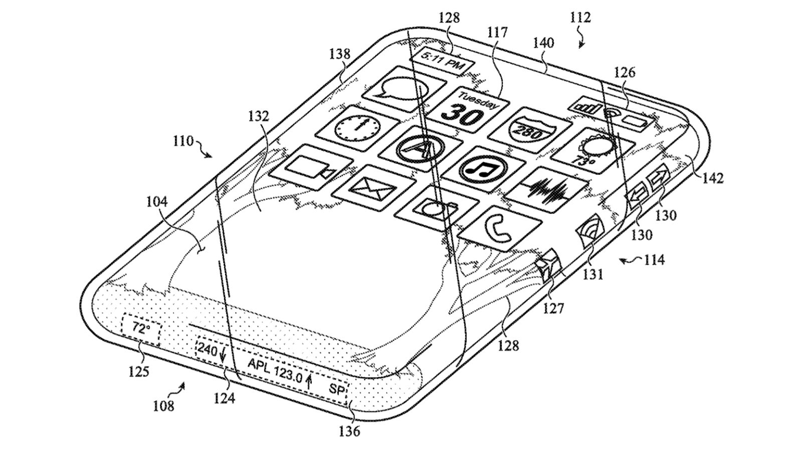 ในสิทธิบัตรสำหรับอุปกรณ์ที่ดูเหมือน iPhone นี้ จะมาพร้อมกับวิธีปิดหน้าจอการสัมผัส และจะมีจอแสดงผลแบบโค้งที่รอบๆ ตัวเครื่อง และยังเป็นหน้าจอระบบสัมผัสเพื่อสั่งงานต่างๆ อาทิ เพิ่มลดเสียง และยังมีส่วนของการอธิบายเกี่ยวกับการประกอบชิ้นส่วนกรอบกระจกนี้ รวมไปถึงสิทธิบัตรที่อาจจะเป็นกรอบที่สามารถถอดชิ้นส่วนออกเพื่อครอบตัวเครื่องได้