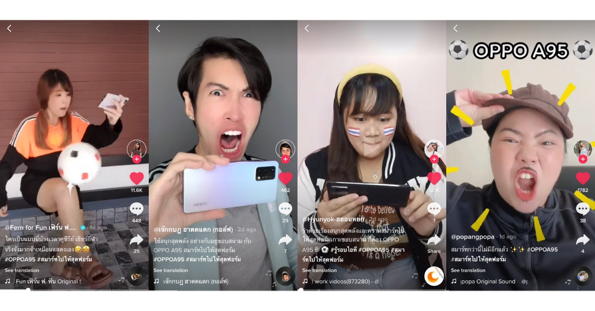 หลังจาก OPPO A95 ประกาศการเป็นพาร์ทเนอร์หลักของ AFF Suzuki Cup 2020 หรือ การแข่งขันฟุตบอลชิงแชมป์อาเซียน ล่าสุดได้มีการจัดกิจกรรมให้ KOL Tiktok สายโหด-มันส์-ฮา ได้จัดเต็มกับการรีวิว OPPO A95 ที่ได้รับแรงบันดาลใจจากธีมฟุตบอล ส่งต่อพลังความสนุกสดใสแบบสมาร์ทไปให้สุดฟอร์ม พร้อมเชิญชวนแฟนๆ เตรียมอุ่นเครื่องเชียร์ทีมฟุตบอลไทยในการแข่งขัน AFF Suzuki Cup 2020 ที่จะเริ่มขึ้นในวันที่ 5 ธันวาคมที่จะถึงนี้  ไม่ว่าจะเป็น @jessicaqueennnn ที่มาในไอเดียสุดครีเอทีฟกับคุณนายเก้าและคุณชายห้า, @jekkabot5555 ที่จัดเต็มกับการพากย์บอลแบบเกาะติดทะลุจอ, หรือ @fern_fernforfun ที่สุดอินพร้อมโชว์ลีลาการเดาะบอลร่วมไปด้วย, และ @hyunyok ที่ร่วมเพนท์หน้าเชียร์บอลกันและรีวิวแบบจัดเต็ม รวมถึงคนอื่นๆ อีกมากมาย ผ่าน #OPPOA95 #สมาร์ทไปให้สุดฟอร์ม