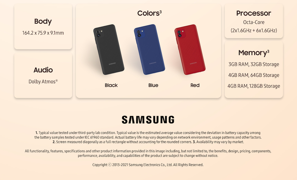 Samsung Galaxy A03 มาพร้อมจอแสดงผล Infinity-V Display ความละเอียด 720 x 1600 ขนาด 6.5 นิ้ว ทำรอยบากรูปตัววีสำหรับติดตั้งกล้องหน้า 5 ล้านพิกเซล (F2.2) ส่วนกล้องหลัง 48 ล้านพิกเซล (F1.8) วางคู่กับกล้อง Depth 2 ล้านพิกเซล (F2.4) รองรับระบบเสียง Dolby Atmos ขนาดบอดี้ 164.2 x 75.9 x 9.1 มิลลิเมตร มีให้เลือก 3 สี ได้แก่ สีดำ, สีน้ำเงิน และ สีแดง