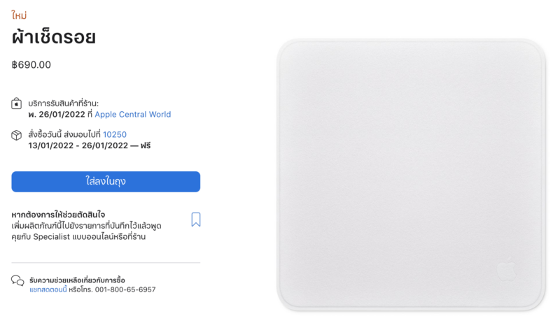 จากรายงานของ AppleInsider ได้รายงานว่าในแคนาดามีผู้ที่ได้รับผ้าเช็ดรอยหน้าจอนี้ก่อนกำหนด ซึ่งบางคนได้รับเร็วกว่ากำหนดถึง 1 เดือน และล่าสุดที่ทีมงาน @flashfly ได้ลองเข้าไปตรวจสอบดู ปรากฏว่า หากทำการสั่งซื้อวันนี้จะได้รับในช่วงวันที่ 13/01/2022 – 26/01/2022 และสามารถรับหน้าร้าน Apple Store Central World ได้ในวันที่ 26/01/2022 ซึ่งเป็นช่วงเวลาเดียวกันกับที่ทางทีมงานเคยตรวจสอบในช่วงปลายเดือนตุลาคม