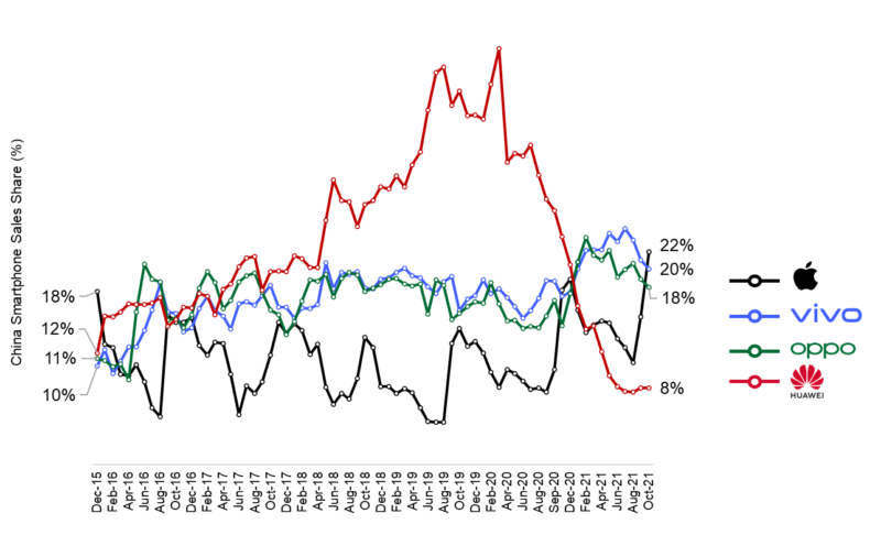 แม้ว่าปัญหาการขาดแคลนชิปและผลกระทบจากการระบาดใหญ่ของ COVID-19 ยอดขาย iPhone ที่เพิ่มขึ้นในจีน ก็ถือเป็นสัญญาณเชิงบวกของ Apple และดูเหมือนว่าลูกค้าชาวจีนกำลังมองหาสมาร์ทโฟนระดับพรีเมียม ซึ่ง Apple ก็เข้ามาแทนที่ Huawei ในช่องว่างตรงนี้
