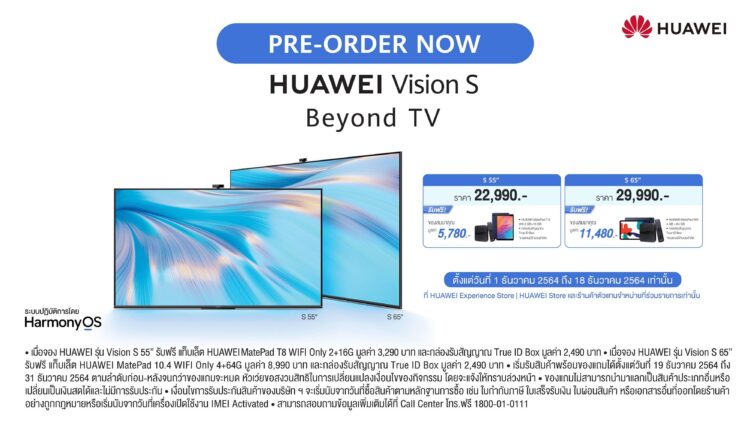 หัวเว่ยมอบข้อเสนอพิเศษสำหรับผู้ที่จับจองเป็นเจ้าของ Beyond TV รุ่นแรกของประเทศไทยในช่วง Pre-order รับของสมนาคุณสุดเอ็กซ์คลูซีฟรวมมูลค่าสูงสุด 11,480 บาท ทั้งกล่องรับสัญญาณ True ID Box และ HUAWEI MatePad 4 GB + 64 GB เมื่อสั่งจอง HUAWEI Vision S ตั้งแต่วันที่ 1 ธันวาคม 2564 – 18 ธันวาคม 2564 ของแถมมีจำนวนจำกัดและเงื่อนไขเป็นไปตามที่บริษัทกำหนด โดยสามารถติดตามรายละเอียดเพิ่มเติมเกี่ยวกับผลิตภัณฑ์ได้ที่นี่ เป็นเจ้าของได้ที่ HUAWEI Experience Store และร้านค้าตัวแทนจำหน่ายที่ร่วมรายการ รวมถึง HUAWEI Store หรือผ่านช่องทางของตัวแทนจำหน่ายอย่างเป็นทางการทั้ง JD Central, Shopee และ Lazada