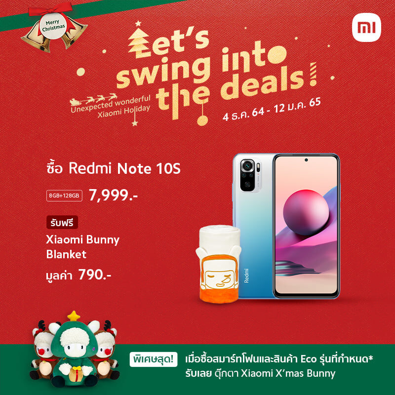 - Redmi Note 10S (รุ่นความจุ 8GB + 128GB) – สมาร์ทโฟนระดับ mid-range สุดหรูหราที่จะช่วยยกระดับความบันเทิงของผู้ใช้ พร้อมระบบชาร์จไว 33W ที่สามารถทำให้ใช้งานได้ลื่นไหลตลอดทั้งวันใน ราคา 7,999 บาท รับฟรี! Xiaomi Bunny Blanket มูลค่า 790 บาท สามารถซื้อได้ที่ Xiaomi Store และร้านค้าที่ร่วมรายการ