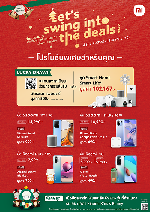 เสียวหมี่ ผู้นำเทคโนโลยีระดับโลก ต้อนรับคริสต์มาสและเทศกาลแห่งการเฉลิมฉลองด้วยแคมเปญ Let’s Swing into the Deals ยกขบวนสมาร์ทโฟนรุ่นยอดนิยมพร้อมของสมนาคุณมากมาย นอกจากนี้ ยังอาจมีสิทธิ์เป็นผู้โชคดี รับชุดผลิตภัณฑ์ Smart Home Smart Life มูลค่ารวม 102,167 บาท จำนวน 10 รางวัล คริสต์มาสนี้เสียวหมี่ใจดียิ่งกว่าซานต้า มอบความพิเศษจัดเต็มนี้ ตั้งแต่วันที่ 4 ธันวาคม 2564 – 12 มกราคม 2565 ณ Xiaomi Store และร้านค้าที่ร่วมรายการเท่านั้น