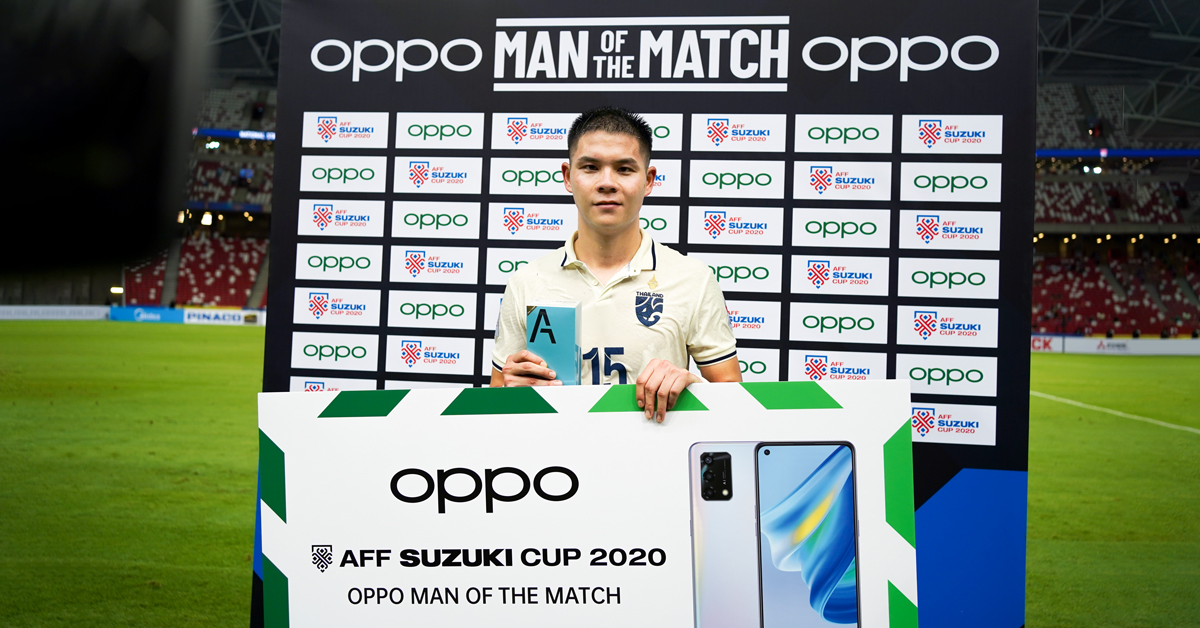 OPPO ประกาศ “OPPO Man of the Match” รายแรกในการแข่งขัน “AFF Suzuki Cup 2020” ศึกลูกหนังที่ยิ่งใหญ่ที่สุดแห่งภูมิภาคอาเซียนโดยในงานนี้ทีมชาติไทยไม่ทำให้ผิดหวัง เปิดศึกโชว์ฟอร์มเด็ดฟาดแข้งเอาชนะแมตช์แรกระหว่างติมอร์ เลสเต ที่ 2-0 โดยครั้งนี้ “นฤบดินทร์ วีรวัฒโนดม” โชว์ฟอร์มเด็ดและดีที่สุดในสนาม ได้รับคัดเลือกคว้า “OPPO Man of the Match” คนแรกของการแข่งขัน พร้อมได้รับ OPPO A95 สมาร์ทโฟนใหม่ล่าสุดที่เป็นพาร์ทเนอร์หลักสำหรับการแข่งขันในปีนี้