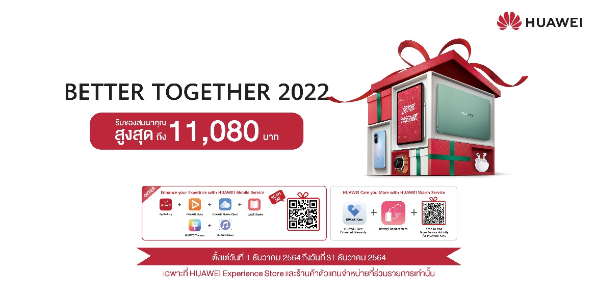 หัวเว่ย คอนซูมเมอร์ บิสสิเนส กรุ๊ป (ประเทศไทย) เปิดโปรเด็ดรับเดือนแห่งเทศกาลส่งมอบความสุข อยู่อย่างห่วงใยไปด้วยกัน ด้วยโปรโมชัน Better Together 2022 นำเสนอสินค้าพร้อมของสมนาคุณสูงสุด 11,080 บาทพร้อมมอบส่วนลดสุดพิเศษสำหรับผลิตภัณฑ์ชั้นนำอีกมากมาย สำหรับผู้ที่ซื้อสินค้าผ่านทางหน้าร้าน HUAWEI Experience Store ร้านค้าตัวแทนจำหน่ายที่ร่วมรายการทั่วประเทศ ตั้งแต่วันที่ 1 ธันวาคม 2564 ถึง 31 ธันวาคม 2564 รวมทั้งซื้อหาได้ทางออนไลน์เริ่มต้นวันที่ 15 ธันวาคม 2564 ถึง 31 ธันวาคม 2564 ที่ HUAWEI Store และร้านค้าออนไลน์อย่างเป็นทางการของหัวเว่ยใน Shopee, Lazada และ JD Central