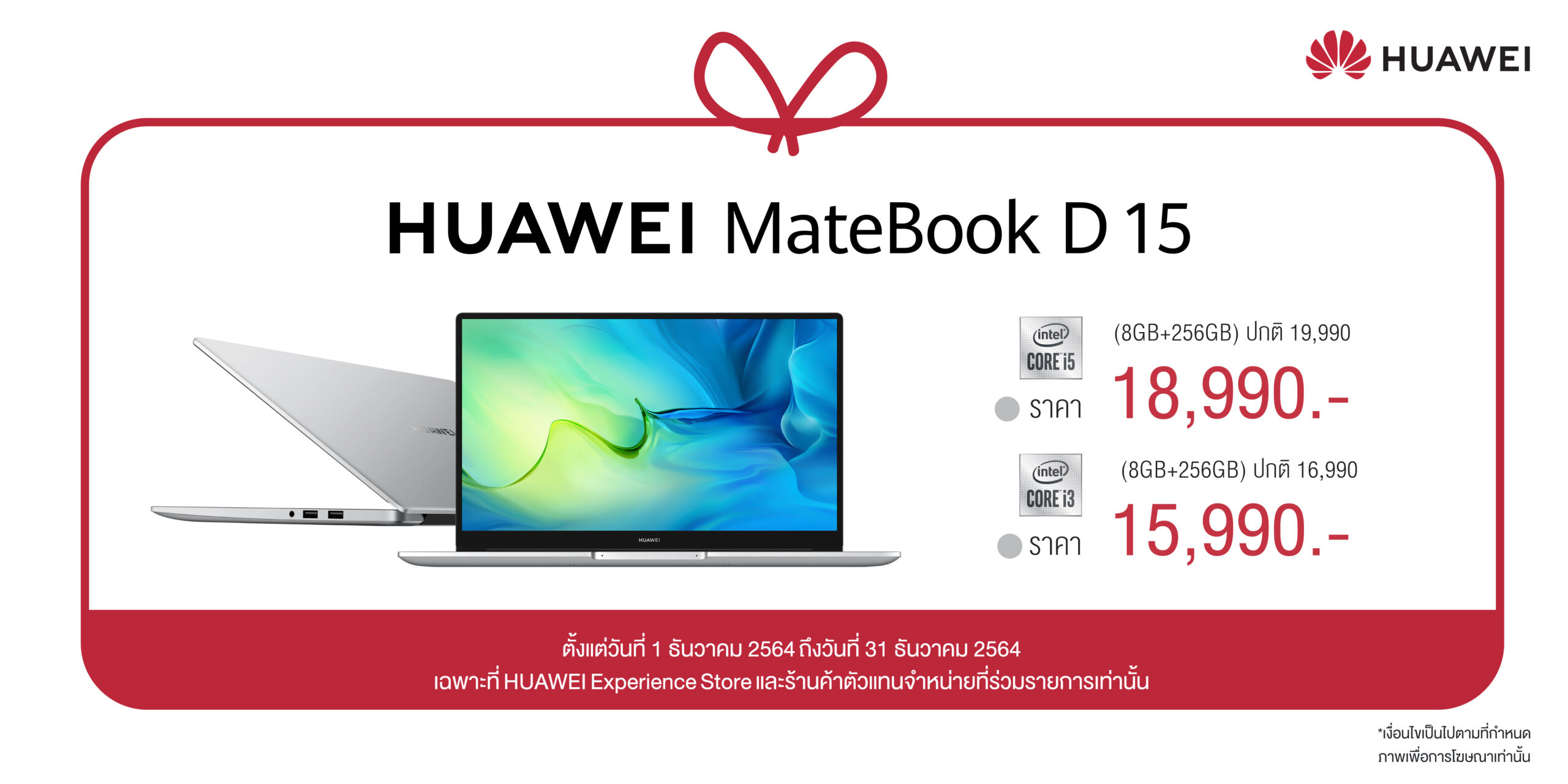 HUAWEI MateBook D 15 มาในสี Space Gray และ Mystic Silver มีให้เลือก 4 รุ่น ได้แก่ ชิปเซ็ต 11th Gen Intel® CoreTM i5 processor รุ่นหน่วยความจำ 8GB + 512GB และ 16GB + 512GB และ ชิปเซ็ต 10th Gen Intel® CoreTM i5 processor รุ่นหน่วยความจำ 8GB + 256GB และ ชิปเซ็ต 10th Gen Intel® CoreTM i3 รุ่นหน่วยความจำ 8GB + 256GB รองรับการทำงานที่หลากหลาย วางจำหน่ายในราคาเริ่มต้นที่ 15,990 บาท จากราคาปกติ 16,990 บาท