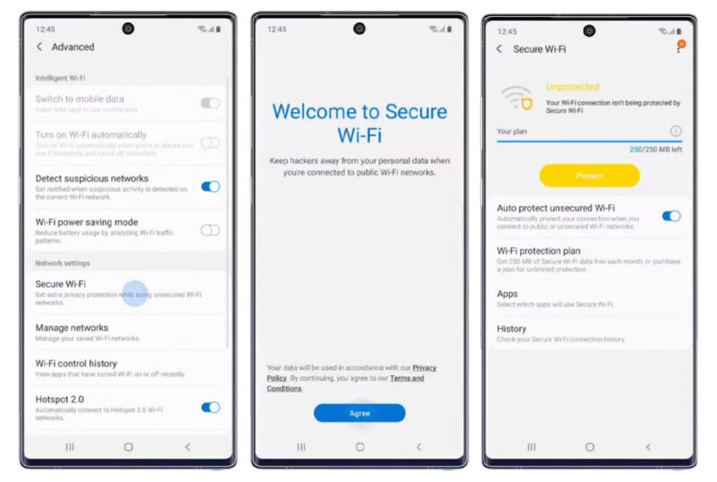 วิธีที่ซัมซุงปกป้องผู้ใช้จากภัยคุกคาม: Secure Wi-Fi[5]  จะปกป้องการท่องเว็บไซต์ของคุณด้วยการเข้ารหัสการส่งข้อมูลอินเทอร์เน็ตและปิดใช้งานการติดตามแอปฯและเว็บไซต์ ซึ่งจะช่วยให้ผู้ใช้สามารถเข้าชมเว็บไซต์ต่างๆ ได้อย่างปลอดภัยผ่านการเชื่อมต่ออินเทอร์เน็ตสาธารณะโดยไม่ต้องเป็นกังวล[6]
