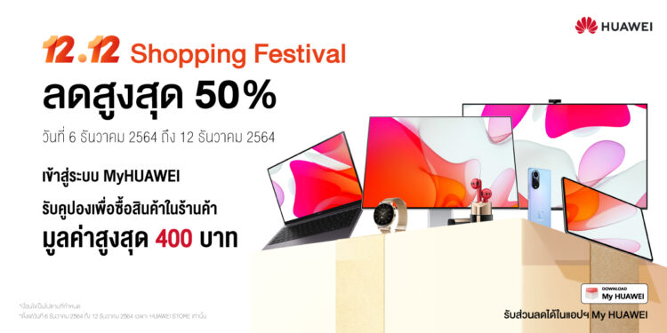หัวเว่ย คอนซูมเมอร์ บิสสิเนส กรุ๊ป (ประเทศไทย) ไม่พลาดฤดูกาลแห่งเทศกาลช็อปปิงส่งท้ายปี ส่งโปรโมชัน 12.12 Shopping Festival เอาใจลูกค้ากันแบบไม่ขาดสายด้วยสินค้าไอทีที่ลดราคาสูงสุดถึง 50% ทั้งใน HUAWEI Store ร้านค้าอย่างเป็นทางการของหัวเว่ยใน Shopee และ Lazada แถมดีลเอ็กซ์คลูซีฟ Flash Sale เริ่มต้น 10 บาท สำหรับลูกค้าที่ซื้อสินค้าในเว็บไซต์ HUAWEI Store ผ่านแอปพลิเคชัน My HUAWEI เท่านั้นโปรฯ สุดคุ้มกว่าใคร ระหว่างวันที่ 6 ธันวาคม 2564 ถึง 12 ธันวาคม 2564