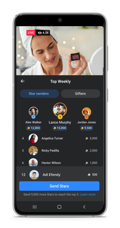 • เครื่องหมายดาวและลีดเดอร์บอร์ด เครื่องหมายดาวจะปรากฏถัดจากชื่อของแฟนๆ เมื่อบุคคลเหล่านั้นแสดงความคิดเห็นบนสตรีมสดและจะแสดงระดับเครื่องหมายที่ต่างกันออกไปตามจำนวนดาวที่แต่ละบุคคลส่งให้ครีเอเตอร์ในช่วงสัปดาห์ที่ผ่านมา นอกจากนี้ เรายังได้เปิดตัวลีดเดอร์บอร์ดดาวบนประสบการณ์ Facebook Live ที่จะแสดงรายชื่อผู้ที่ส่งดาวให้ครีเอเตอร์แต่ละรายในอันดับต้นๆ ในแต่ละสัปดาห์อีกด้วย
