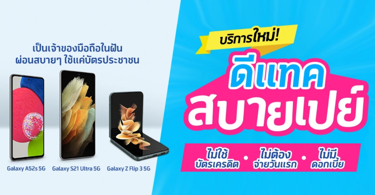 ดีแทคมอบบริการพร้อมข้อเสนอพิเศษนี้ให้ลูกค้าดีแทคปัจจุบัน ให้รับสิทธิ์ผ่อนสมาร์ทโฟนซัมซุง 0% ทั้งค่าเครื่องและค่าบริการ สบายๆ นานสูงสุดถึง 24 เดือน โดยมอบความพิเศษสุดสำหรับลูกค้าดีแทค ระบบรายเดือนที่มีอายุการใช้งานมากกว่า 6 เดือน ตามเงื่อนไข ผ่อนสบายๆ ใช้แค่บัตรประชาชน สำหรับลูกค้าใหม่ที่เปิดเบอร์ระบบรายเดือน สามารถผ่อนจ่ายค่าเครื่องและค่าบริการ ผ่านบริการผ่อนชำระสินค้าออนไลน์ “เปย์ทันเด้อ” จากแอปพลิเคชัน “เงินทันเด้อ” ผ่อนสมาร์ทโฟน Samsung Galaxy A Series สบายๆ นาน 12 เดือน