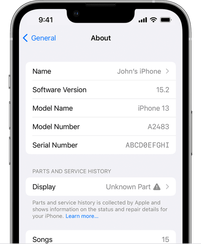 หากชิ้นส่วนหรืออะไหล่ที่เปลี่ยนมาเป็นของแท้นั้นจะขึ้นข้อความว่า “ชิ้นส่วนแท้ของ Apple” หรือ “Genuine Apple Part และถ้ามีการเชื่อมต่ออินเทอร์เน็ต ก็สามารถแตะที่ส่วนเพื่อดูข้อมูลเพิ่มเติม รวมถึงวันที่ของบริการได้