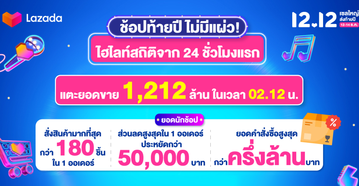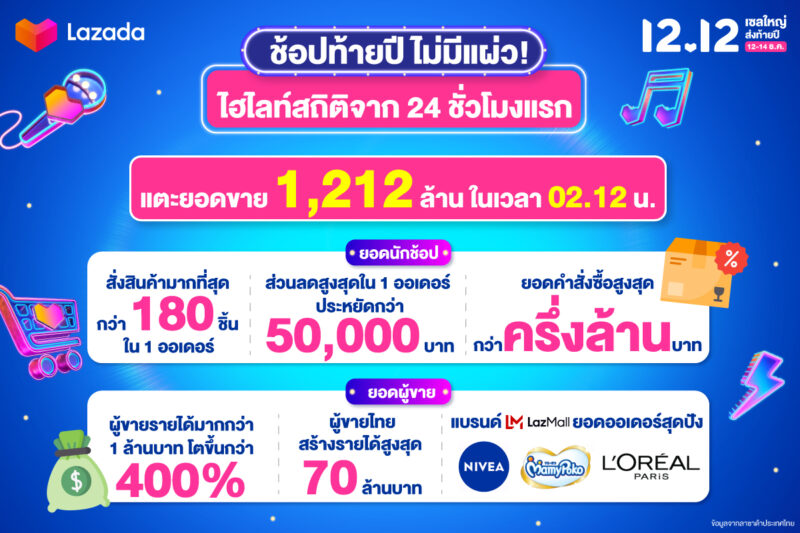 ลาซาด้า ผู้นำแพลตฟอร์มอีคอมเมิร์ซในเอเชียตะวันออกเฉียงใต้ สร้างตำนานใหม่อีกครั้ง โกยยอดขาย 1,212 ล้านบาทในเวลา 02.12 น. ของวันที่ 12 ธันวาคม 2564 ภายใต้แคมเปญ “Lazada 12.12 Grand Year-End Sale เซลใหญ่ส่งท้ายปี” โดยมีนักช้อปสายเปย์ซื้อสินค้ามากที่สุดกว่า 180 ชิ้นใน 1 ออเดอร์ และดันผู้ขายที่สร้างรายได้มากกว่า 1 ล้านบาทโตขึ้นกว่า 400% ในวันแรกเมื่อเทียบกับช่วงเวลาเดียวกันในแคมเปญ 12.12 ปีที่แล้ว เรียกได้ว่าเป็นเมกะแคมเปญสุดท้ายของปีที่มอบความคุ้มค่าให้นักช้อปแบบเต็มพิกัด กับส่วนลดท็อปปิ้งลาซาด้า 6 ต่อ ซึ่งรวมถึงลาซาด้าโบนัส ที่ไม่มีแพลตฟอร์มอีคอมเมิร์ซไหนสามารถให้ได้ พร้อมส่งท้ายปีวัวทองอย่างงดงาม