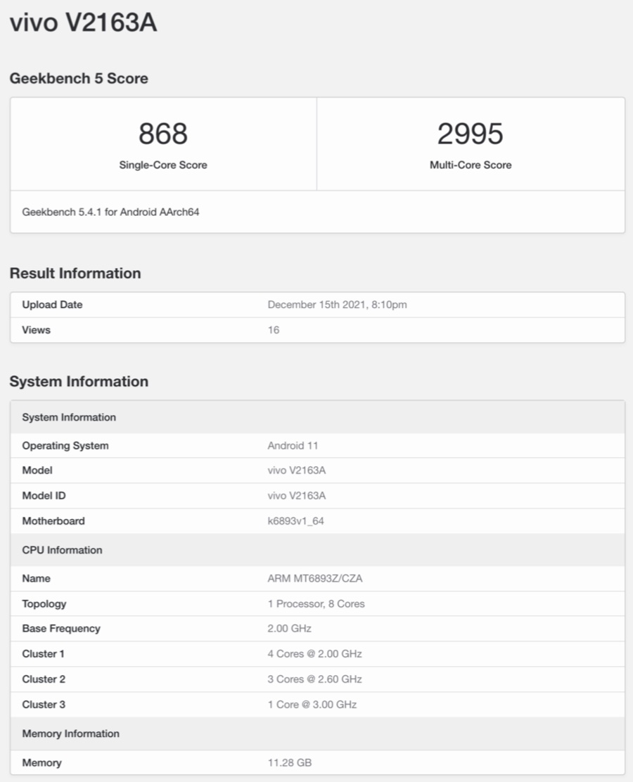 vivo กำลังจะเปิดตัวสมาร์ทโฟน vivo S12 series ในประเทศจีนวันที่ 22 ธันวาคมนี้ โดยคาดว่าจะมีอย่างน้อย 2 รุ่น ได้แก่ S12 และ S12 Pro ซึ่งล่าสุดพบว่ารุ่น Pro ได้รับการทดสอบประสิทธิภาพแล้ว ผ่านแอปพลิเคชั่น Geekbench โดยใช้รหัสรุ่น V2163A