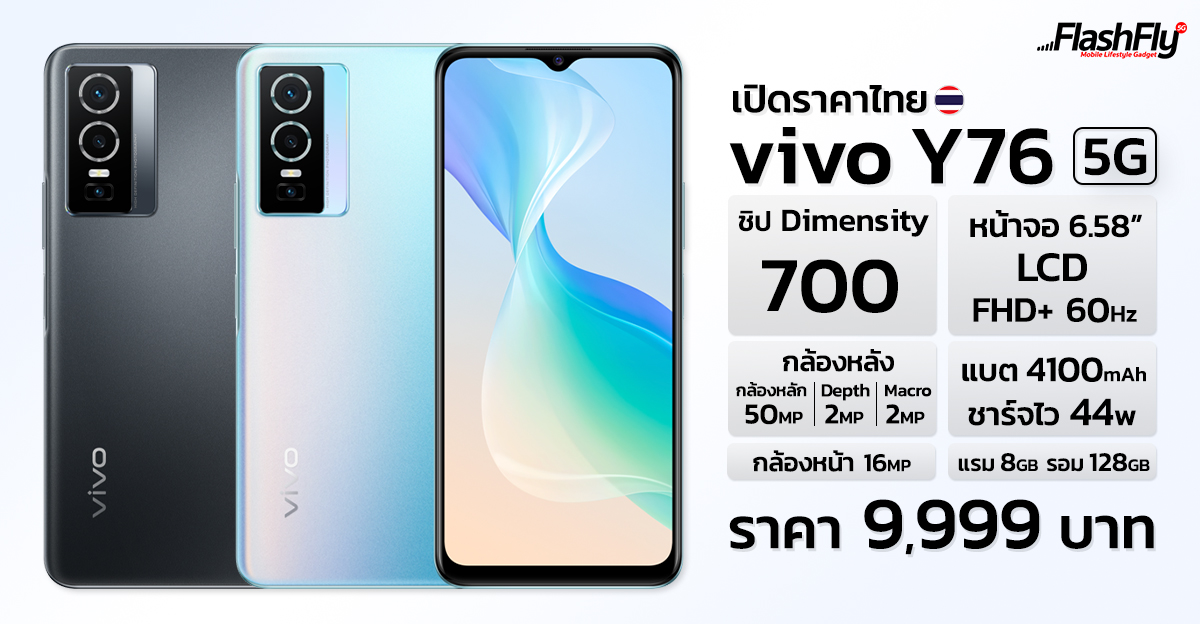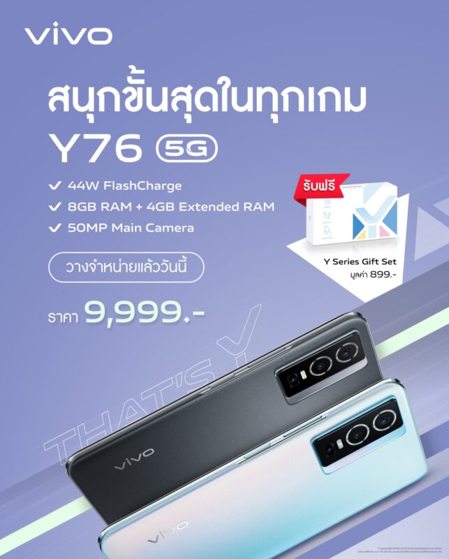 vivo แบรนด์สมาร์ตโฟนชั้นนำระดับโลก ส่งสมาร์ตโฟนรุ่นใหม่ล่าสุดในตระกูล Y Series กับ vivo Y76 5G สนุกขั้นสุดในทุกเกม ตอกย้ำความเป็นผู้นำสมาร์ตโฟนรองรับการเชื่อมต่อสัญญาณ 5G ภายใต้แนวคิด ‘That’s Y Enjoy the moment, Enjoy your life’ พร้อมเอาใจเหล่าเกมเมอร์กับชิปเซ็ตประมวลผล MediaTek Dimensity 700 แบตเตอรี่ความจุ 4100mAh รองรับเทคโนโลยีชาร์จไวถึง 44 วัตต์ RAM 8GB +4GB ให้สนุกขั้นสุดกับทุกเกมที่ชื่นชอบได้ตลอดทั้งวัน พร้อมถ่ายภาพคมชัดด้วยกล้องหลักความละเอียด 50MP พร้อมให้เป็นเจ้าของแล้ววันนี้ ในราคาเพียง 9,999 บาท รับฟรี Y Series Gift Set มูลค่า 899 บาท