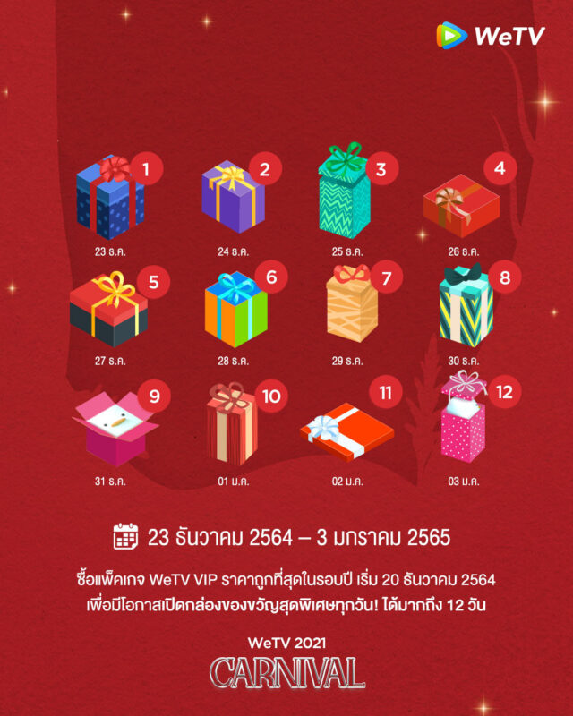 มาเติมความสุข และส่งต่อความบันเทิงเพื่อฉลองช่วงเวลาแห่งความสุขส่งท้ายปีไปกับ WeTV Carnival พร้อมส่งกิฟท์การ์ดอวยพรวันปีใหม่ให้กับครอบครัว เพื่อนๆ หรือคนที่คุณรักกันได้ตั้งแต่วันนี้ – 3 มกราคม 2565 สามารถติดตามความเคลื่อนไหวของกิจกรรมได้ทางแอปพลิเคชัน WeTV และทุกช่องทางออนไลน์ของ WeTV Thailand