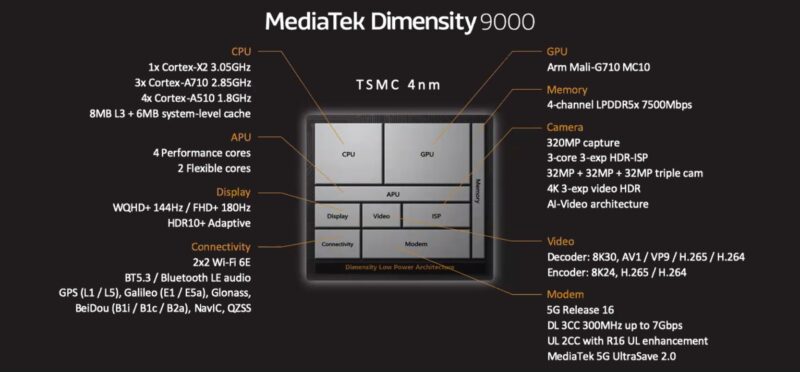 Dimensity 9000 เป็นชิปสมาร์ทโฟนรุ่นแรกของโลกจากกระบวนการผลิต TMSC N4 (4 นาโนเมตร-class) ที่เปี่ยมสมรรถนะขั้นสูงสุด ทะยานขึ้นเป็นผู้นำธุรกิจในด้านขีดความสามารถคอมพิวติ้ง เกมมิ่ง ภาพ มัลติมีเดีย และนวัตกรรมการเชื่อมต่อ
