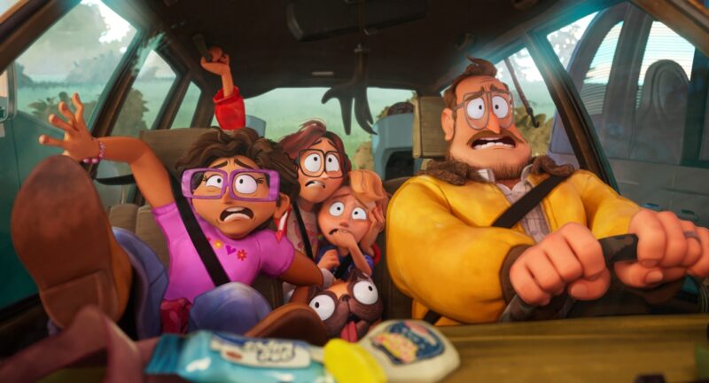 THE MITCHELLS VS. THE MACHINES – (L-R) Maya Rudolph as “Linda Mitchell”, Abbi Jacobson as “Katie Mitchell”, Doug the Pug as “Monchi”, Mike Rianda as “Aaron Mitchell” and Danny McBride as “Rick Mitchell”. Cr: ©2021 SPAI. All Rights Reserved.