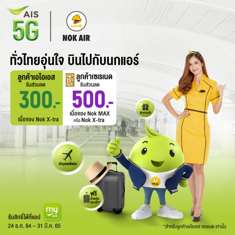 สำหรับความพิเศษในครั้งนี้ AIS และนกแอร์ ได้มอบประสบการณ์การท่องเที่ยวสุดคุ้ม 2 ต่อ คือ 1.รับส่วนลดค่าตั๋วเดินทางสำหรับลูกค้า AIS และ AIS Serenade โดยลูกค้า AIS รับส่วนลด 300 บาท เมื่อจอง Nok X-tra (ที่นั่ง+น้ำหนักกระเป๋า 15 กก.) ด้านลูกค้า Serenade ลด 500 บาท เมื่อจอง Nok Max (ที่นั่ง+น้ำหนักกระเป๋า 20 กก.) และรับน้ำหนักกระเป๋าเพิ่มฟรีอีก 10 กก. พร้อมสิทธิ์ขึ้นเครื่องก่อนใคร (Priority Boarding)