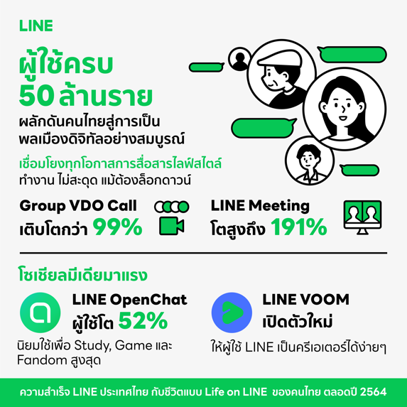 ปี 2564 เป็นปีที่ LINE ครบรอบ 10 ปี สามารถพิชิตยอดผู้ใช้งานถึง 50 ล้านคน นับเป็นจุดเริ่มต้นของการเป็นพลเมืองดิจิทัลของคนไทยมากกว่า 2 ใน 3 ของจำนวนประชากรไทยทั้งหมด LINE ยังคงทำหน้าที่ช่วยเชื่อมผู้คนผ่านฟีเจอร์สื่อสารต่าง ๆ ให้ได้ใกล้กันอย่างต่อเนื่อง เช่นเดียวกันกับในสถานการณ์ล็อกดาวน์ที่การสื่อสารของคนไทยไม่สะดุดแม้ต้องรักษาระยะห่าง เห็นได้จาก LINE Group VDO Call ที่ทะยานสูงถึง 99% (ระหว่างม.ค. – ต.ค. เทียบกับช่วงเดียวกันของปีก่อนหน้า) ในขณะเดียวกัน LINE Meeting ก็เติบโตสูงขึ้นถึง 191% (นับตั้งแต่ช่วงเปิดตัวเมื่อ ส.ค. 2563) สะท้อนให้เห็นว่าคนไทยนั้นนอกจากจะใช้ LINE สื่อสารในชีวิตประจำวันแล้ว  ยังใช้ในการทำธุรกิจและการทำงานช่วง Work From Home อีกด้วย