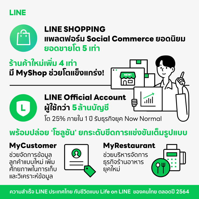 LINE Official Account ยังคงครองตำแหน่งช่องทางยอดนิยมของธุรกิจไทยในการนำเสนอสินค้าและบริการ พร้อมการพูดคุยและปิดการขาย ด้วยยอดการใช้งานที่เพิ่มขึ้นเป็น 5 ล้านบัญชี (ณ เดือน ส.ค. 2564) เป็นการเติบโตถึง 25% ภายใน 1 ปี ครองใจผู้ประกอบการทุกขนาดทั้งองค์กรใหญ่, MSMEs รวมไปถึงแบรนด์แฟชันลักชัวรี ด้วยการเป็นช่องท่างที่ช่วยให้เข้าถึงกลุ่มลูกค้าอย่างถึงลูกถึงคน