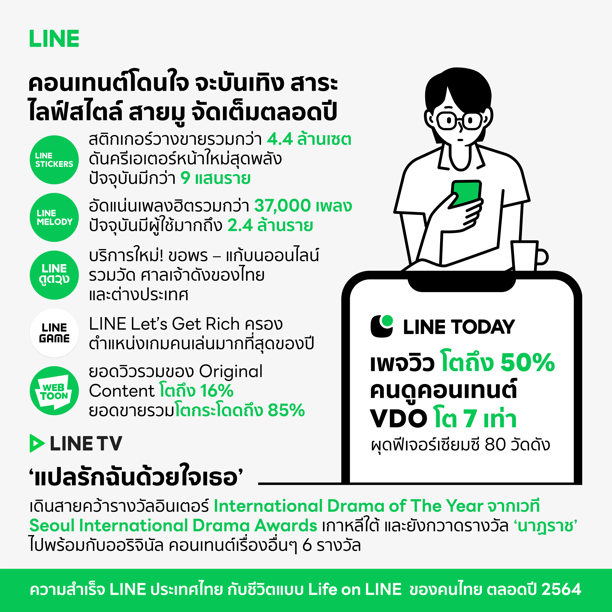 ขณะที่ฟาก LINE TODAY ที่กลายเป็นแพลตฟอร์มคอนเทนต์ที่มากกว่าแค่สาระ ให้ตามทันทุกเทรนด์ก็มียอดเพจวิวโตถึง 50% จากปีก่อน เจาะกลุ่มคนรุ่นใหม่ด้วยสารพันคอนเทนต์ไลฟ์สไตล์หลากหลาย คอนเทนต์วิดีโอสั้นมาแรงที่มีผู้ชมเพิ่มถึง 7 เท่า และไม่ลืมที่จะเอาใจสายมูด้วยฟีเจอร์เซียมซีจาก 80 วัดดัง แล้วไปมูกันต่อยาวๆ กับ LINE DOODUANG บริการใหม่ที่ออกมาเพื่อเสริมประสบการณ์ขอพร – แก้บนออนไลน์ได้โดยไม่ต้องออกจากบ้าน