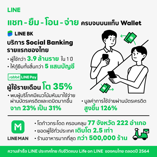 จากความสามารถในการตอบโจทย์และความต้องการการใช้งานในแบบ แชท-ยืม-โอน–จ่าย ที่ทำให้บริการด้าน Fintech ของแอปฯ LINE สมบูรณ์และโดดเด่นสำหรับผู้ใช้ในเมืองไทย เห็นได้จากการเติบโตของบริการด้านการเงิน อย่าง LINE BK บริการ social banking รายแรกของไทย ตลอดหนึ่งปีที่ผ่านมา LINE BK มีผู้ใช้บริการกว่า 3.9 ล้านราย มีการเปิดใช้งานบัญชีเงินฝาก 4.5 ล้านบัญชี บัตรเดบิต 2 ล้านบัตร ส่วนใหญ่เป็นบัตรประเภทออนไลน์ ซึ่งสอดคล้องกับพฤติกรรมช้อปปิงออนไลน์ที่สูงขึ้น ขณะที่ด้านบริการให้กู้ยืมนั้นมีวงเงินให้ยืมทั้งสิ้นกว่า 5 แสนบัญชี เพิ่มโอกาสการเข้าถึงแหล่งเงินทุนที่เชื่อถือได้สำหรับเหล่าฟรีแลนซ์และผู้ที่ไม่มีรายได้ประจำ