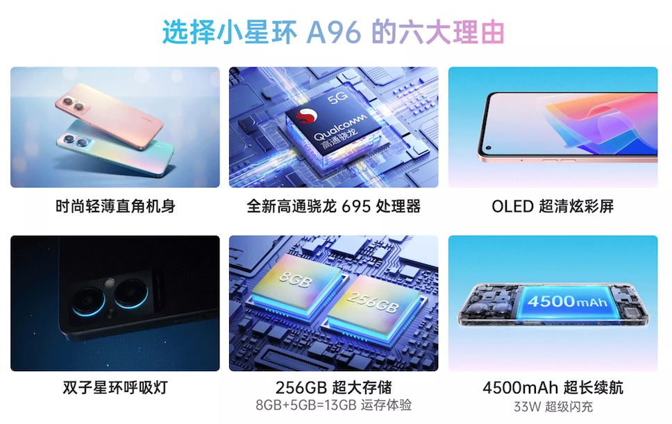 OPPO A96 5G มาพร้อมไฟวงแหวน LED ที่กล้องคู่หลัง ใช้ชิป Snapdragon 695 ราคาราว 10,490 บาท