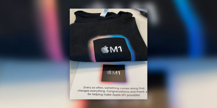 เพื่อเป็นการเฉลิมฉลองครบรอบ 1 ปีของชิป Apple M1 ปลายปี 2021 ที่ผ่านมา Apple ได้จัดทำเสื้อยดลายพิเศษ ชิป M1 แจกจ่ายให้กับทีมวิศวกรที่พัฒนาชิป Apple Silicon นี้ขึ้นมา ซึ่งบัญชีทวิตเตอร์ @aboretto ที่เป็น Senior software engineering manage ได้ทำการทวิตรูปภาพเสื้อยืดนี้ออกมา พร้อมกับคำขอบคุณจาก Apple