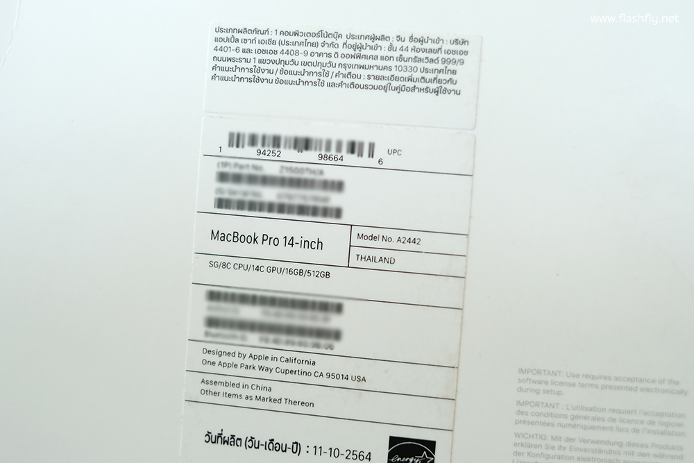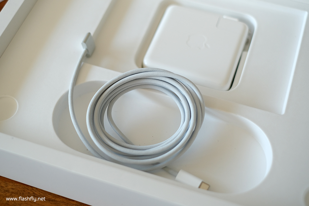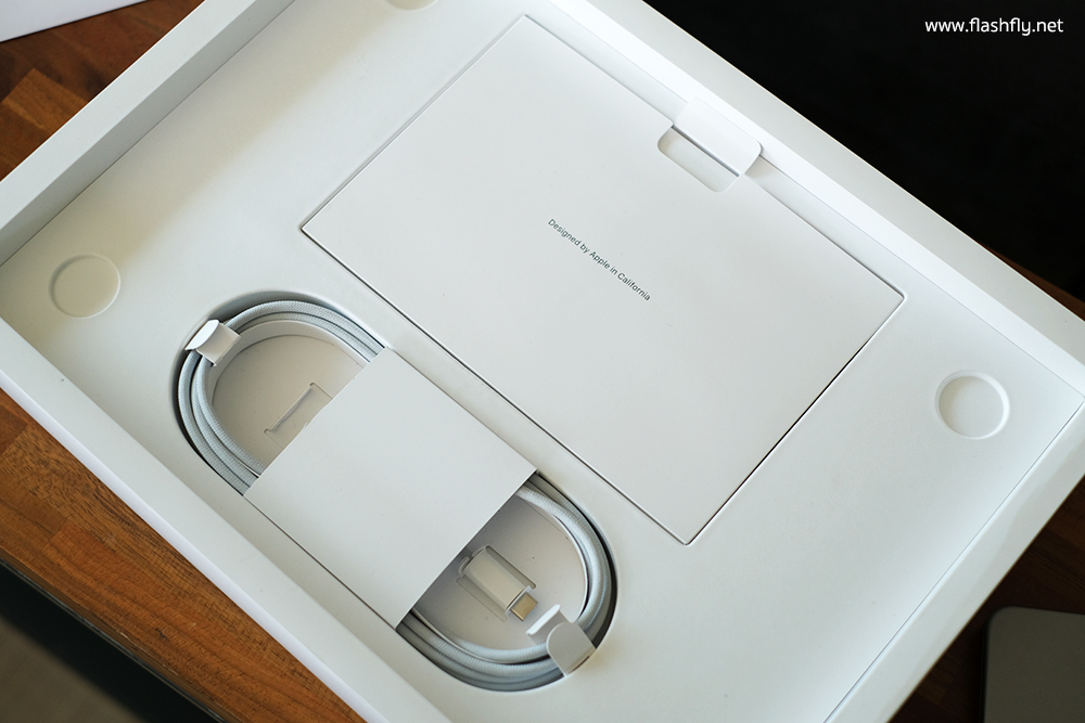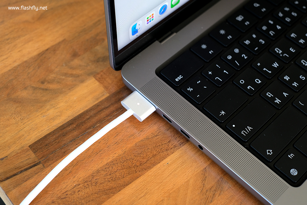 ซึ่งภายในกล่องก็มาจะมาพร้อมกับสายถัก USB‑C ที่เป็น MagSafe 3 สำหรับใช้งานร่วมกับอะแดปเตอร์แปลงไฟ USB‑C ขนาด 67 วัตต์ที่มีมาให้ในกล่องเช่นกัน (มาในรุ่นที่มีชิป M1 Pro พร้อม CPU แบบ 8‑core สำหรับรุ่นที่มีชิป M1 Pro แบบ 10-Core หรือ M1 Max จะได้รับอะแดปเตอร์แปลงไฟ USB‑C ขนาด 96 วัตต์) และในซองเอกสารก็จะมีคู่มือการใช้งาน, ใบรับประกันตัวเครื่องทั้งภาษาไทยและภาษาอังกฤษ, เอกสารยืนยันการรับรองจาก กสทช. และ สติ๊กเกอร์โลโก้ Apple สีดำ 2 ชิ้น ซึ่งโดยรวมจะมีมาให้ไม่ต่างจาก MacBook Pro รุ่น 16 นิ้วเลย