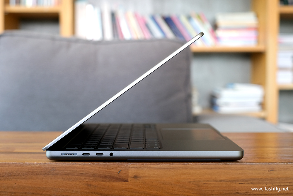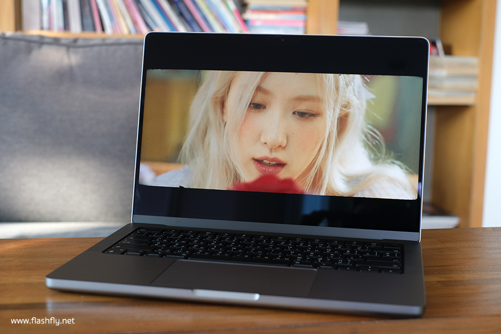 ด้านหน้า พบกับหน้าจอขนาด 14.2 นิ้ว มาพร้อมดีไซน์รอยบากบนหน้าจอ ซึ่งส่วนใหญ่แล้วพื้นที่ตรงกลางที่เป็นรอยบากมักจะไม่มีการใช้งาน จึงเป็นผลดีที่ทำให้มีพื้นที่แสดงผลมากขึ้น และตรงรอยบากนี้จะมีการติดตั้งกล้องหน้า FaceTime HD ความละเอียด 1080p ไว้อยู่