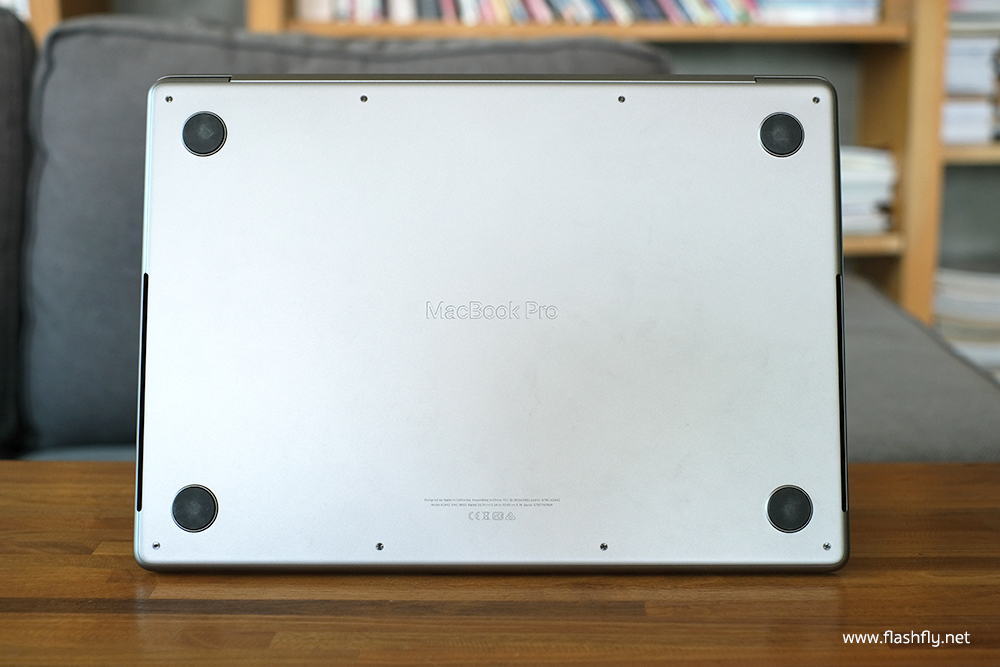 ด้านล่างตัวเครื่องมีการปั้มชื่อ MacBook Pro ไว้ที่ตรงกลาง พร้อมกับติดแผ่นยางวงกลมไว้ทั้ง 4 มุมเพื่อให้วางตัวเครื่องได้อย่างมั่นคงและมีช่องระบายความร้อนซ่อนอยู่ตามแนวช่องว่างของบานพับและด้านข้างของตัวเครื่อง