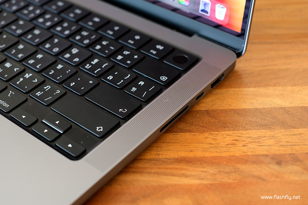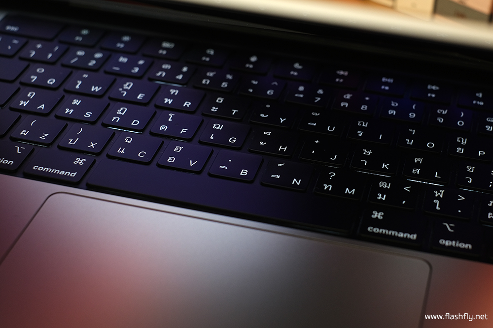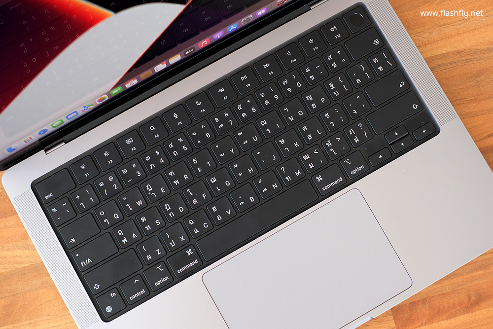 แผงคีย์บอร์ดของ MacBook Pro รุ่น 14 นิ้ว ชิป M1 Pro รุ่นใหม่นี้ได้ดีไซน์เดียวกันกับ MacBook Pro รุ่น 16 นิ้ว โดยแผงคีย์บอร์ด Magic Keyboard จะมาบนแผงสีดำเหมือนกัน หากใครที่ใช้ MacBook Pto รุ่นก่อนหน้าอาจจะรู้สึกแปลกตาไปสักนิด และในรุ่นนี้ได้นำปุ่มฟังก์ชันพร้อมกับปุ่มควบคุมการทำงานต่างๆ แบบดั้งเดิมกลับมาใช้งานแล้ว แต่ยังคงมี Touch ID ที่ใช้ร่วมกับปุ่ม Power วางอยู่มุมขวามือเช่นเคย