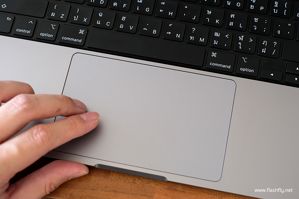 MacBook Pro รุ่น 14 นิ้ว ชิป M1 Pro มาพร้อมแทร็คแพด สามารถควบคุมเคอร์เซอร์ได้อย่างแม่นยำ และรองรับ Force Touch ช่วยให้รับรู้แรงกดในการคลิกลงน้ำหนัก หรือเร่งความเร็วตามแรงกด รวมไปถึงการวาดนิ้วที่ไวต่อแรงกด และคำสั่งหลายนิ้วแบบ Multi-Touch หากใครที่คุ้นเคยหรือใช้งานได้คล่องแล้ว ก็แทบที่จะไม่ต้องพกพาเม้าส์อีกต่อไป