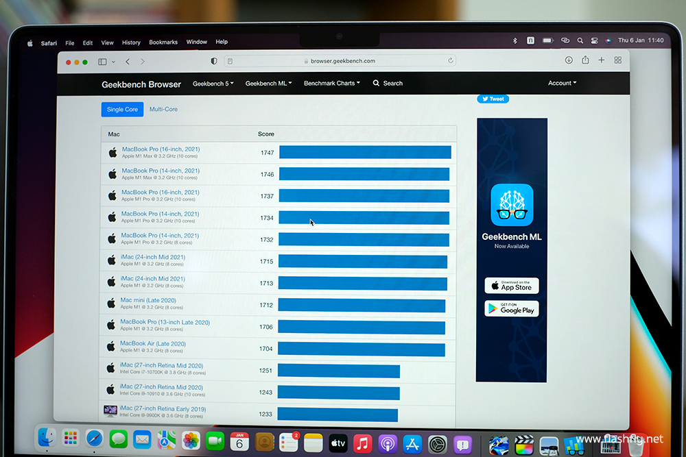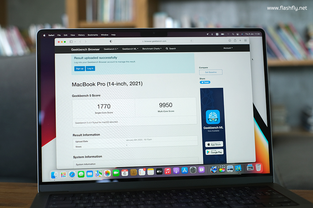 ผลการทดสอบ Geekbench 5 ของ MacBook Pro รุ่น 14 นิ้ว ชิป M1 Pro นั้นได้คะแนน Single-Core ไป 1,770 คะแนน ส่วนคะแนน Multi-Core นั้นได้ไป 9950 คะแนน ถือว่าทำได้ดีในรูปแบบ Single-Core ส่วนด้าน Multi-Core ก็ถือว่าอยู่ในระดับสูง