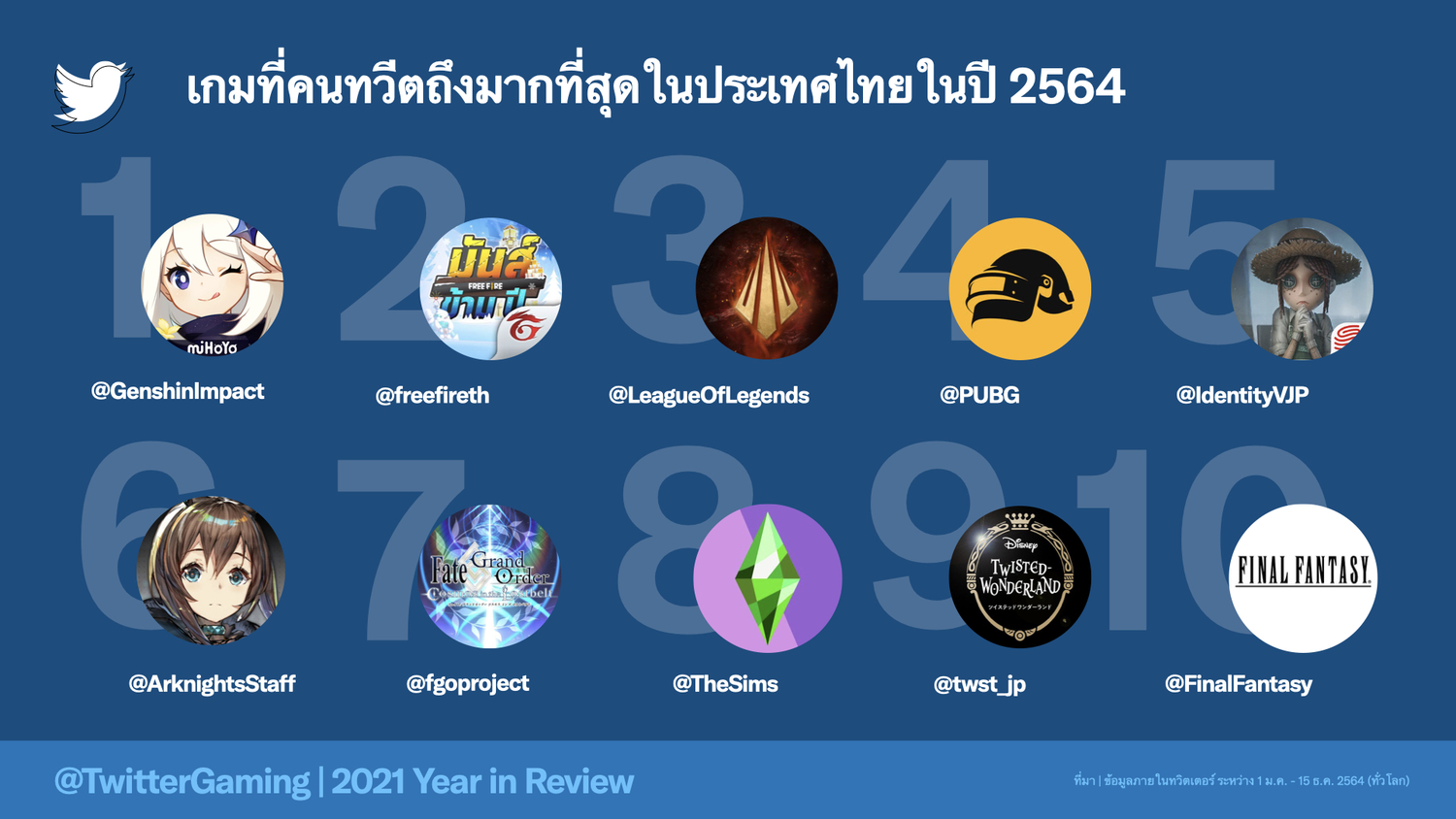สำหรับประเทศไทย Genshin Impact (@GenshinImpact) เป็นเกมที่ถูกพูดถึงมากที่สุดบนทวิตเตอร์ในปี 2564 และอีก 4 อันดับแรกที่ได้รับความนิยมในประเทศไทย คือ Garena Free Fire (@freefireth),League of Legends (@LeagueOfLegends), PUBG: BATTLEGROUNDS (@PUBG) และ Identity V (@IdentityVJP) ส่วนทีมอีสปอร์ตที่ถูกทวีตถึงมากที่สุดในประเทศไทยในปี 2564 ได้แก่ OG (@OGesports), ตามมาด้วย T1 (@T1), Team Secret (@teamsecret), Sentinels (@Sentinels) และ Gambit (@GambitEsports)