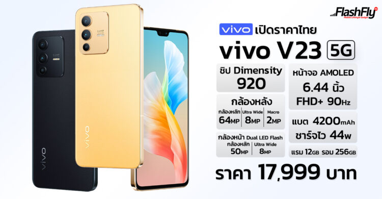 vivo V23 5G เปิดตัวอย่างเป็นทางการแล้ววันนี้ ที่ราคา 17,999 บาท มีให้เลือกทั้งหมด 2 สี ได้แก่ Sunshine Gold และ Stardust Black เตรียมเปิดให้เป็นเจ้าของได้เร็วๆ นี้ ที่ vivo Brand Shop ทุกสาขา และตัวแทนจำหน่ายทั่วประเทศ ติดตามรายละเอียดเพิ่มเติมได้ที่www.vivo.com/th