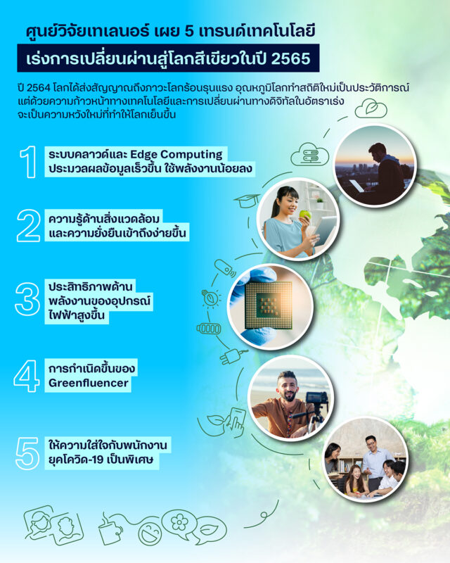 “ศูนย์วิจัยเทเลนอร์” คาดการณ์ 5 ความก้าวหน้าสำคัญทางเทคโนโลยีของโลก ได้แก่ การประมวลผลข้อมูลแบบ Edge บนเครือข่าย 5G, นวัตกรรมด้านพลังงาน, ความรู้ด้านสิ่งแวดล้อมที่เข้าถึงง่ายขึ้น, Greenfluener และความเหลื่อมล้ำจากคนรุ่นโควิด-19 ท่ามกลางเมกะเทรนด์สำคัญอย่างการเปลี่ยนผ่านสู่โลกสีเขียว หลังผู้เชี่ยวชาญชี้สภาวะโลกร้อนยังเลวร้ายได้อีก