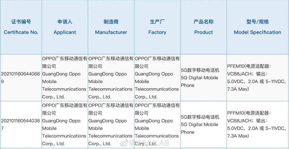 สมาร์ทโฟนเรือธงรุ่นใหม่ของ OPPO ผ่านการรับรองจากหน่วยงาน 3C ในประเทศจีนแล้ว ทั้งรุ่น PFFM10 และ PFEM10 ซึ่งคาดว่าจะเป็น Find X5 และ Find X5 Pro ตามลำดับ โดยข้อมูลที่ 3C เปิดเผยออกมาเก่ยวข้องกับแบตเตอรี่และการชาร์จ