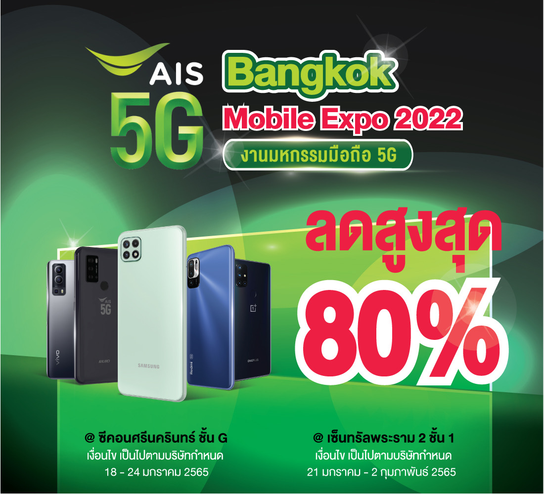 ต้อนรับศักราชใหม่ด้วยงานมหกรรมมือถือครั้งใหญ่สุดร้อนแรงต้อนรับปีเสือ “AIS 5G BANGKOK MOBILE EXPO” งานนี้ AIS จัดเต็มพร้อมต้อนรับทุกคนเข้าสู่ครอบครัว AIS ด้วยเครือข่ายอันดับ 1 พร้อมบริการที่ดีที่สุดสำหรับลูกค้า และโปรโมชั่นส่วนลดสุดพิเศษสูงสุดถึง 80% ไม่ว่าจะเป็น