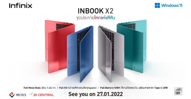 พลาดไม่ได้กับ INBOOK X2เปิดตัวในประเทศไทยอย่างเป็นทางการพร้อมกันในวันที่ 27 มกราคม 2565 ด้วยราคาสุดคุ้ม และจะเริ่มวางจำหน่ายบน JD CENTRAL และร้านตัวแทนจำหน่ายทั่วประเทศในวันที่ 28 มกราคม 2565 ผู้สนใจค้นหารายละเอียดเพิ่มเติมได้ที่ https://bit.ly/3GA3LoN