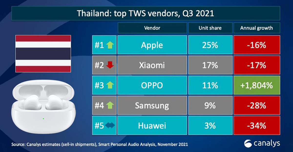 OPPO เผยอัตราการเติบโตยอดขายหูฟัง TWS สูงสุดของประเทศไทย ในไตรมาสที่ 3 ปี 2564 โดยมีอัตราการเติบโตเฉลี่ยต่อปีเพิ่มขึ้นถึง 1,804% อ้างอิงจากการรายงานของ Canalys โดยผลิตภัณฑ์หูฟัง TWS ของ OPPO นั้นล้วนเป็นผลิตภัณฑ์ที่ออกแบบมาโดยคำนึงถึงผู้ใช้งานเป็นหลัก ตามกลยุทธ์สำคัญของ OPPO ที่มุ่งตอบโจทย์ความต้องการของกลุ่มเป้าหมายในทุกส่วน ทำให้ OPPO สามารถเติบโตได้อย่างรวดเร็วและไม่หยุดยั้ง