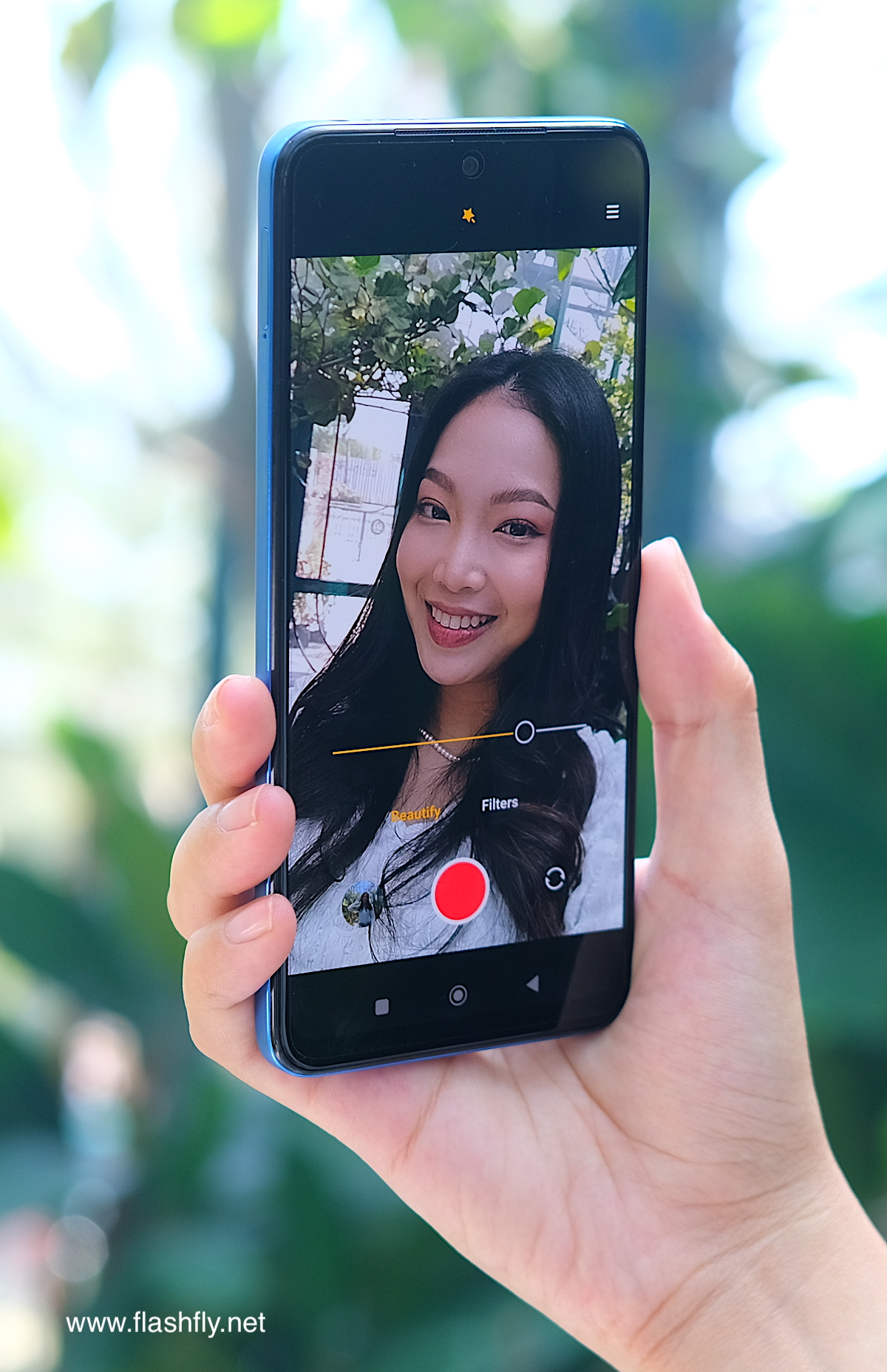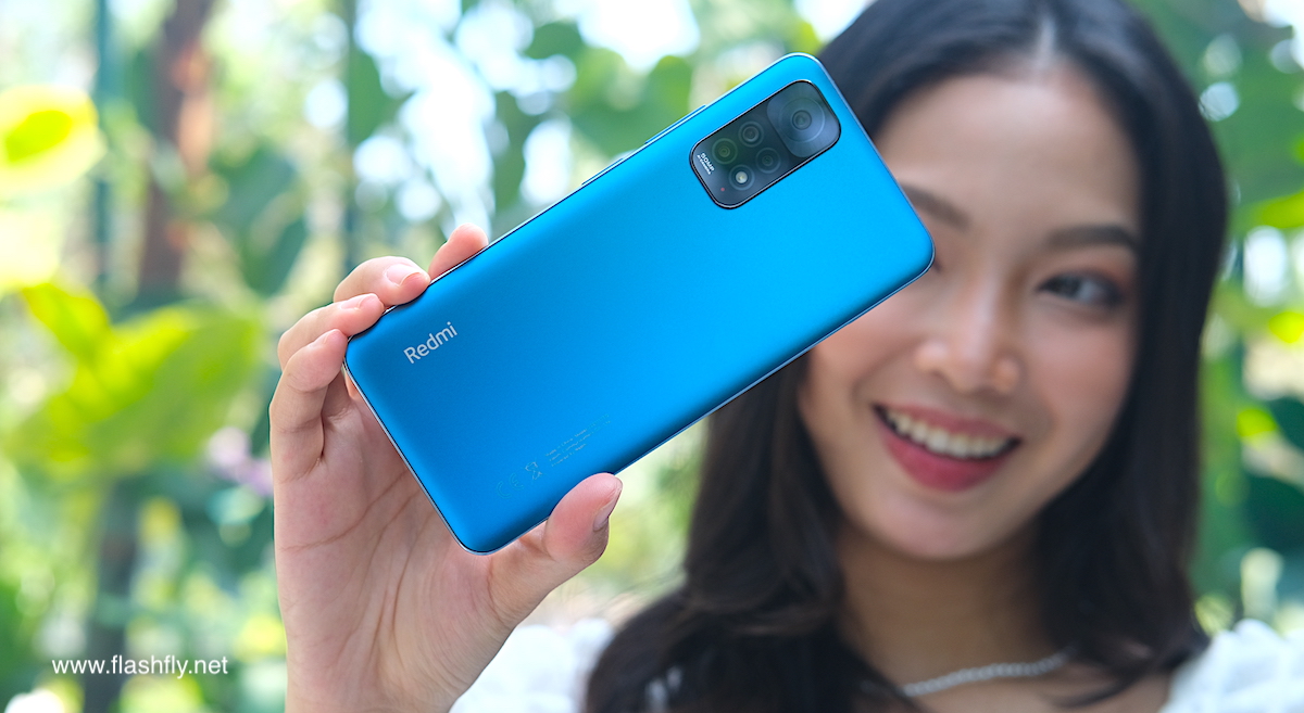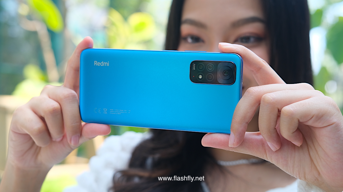 ด้านหลังจะพบกับระบบกล้อง 4 ตัว 50MP AI Quad Camera พร้อมแฟลช LED วางอยู่ในกรอบสี่เหลี่ยมผืนผ้าที่มีขอบมุมโค้งมน ส่วนล่างจะเห้นว่ามีการติดโลโก้ Redmi ในแนวตั้ง