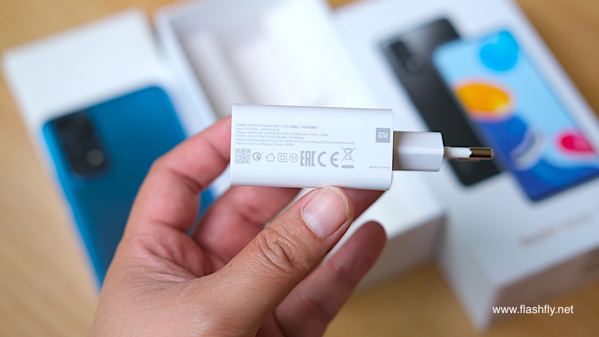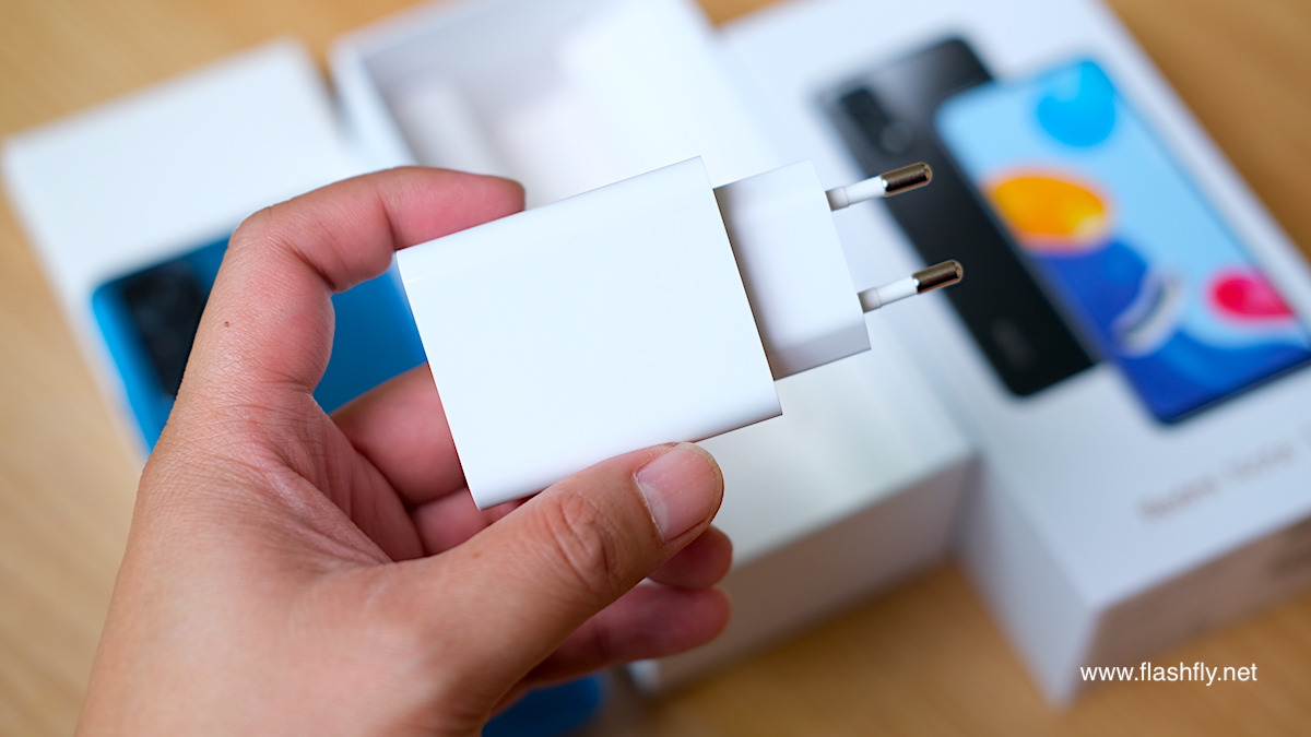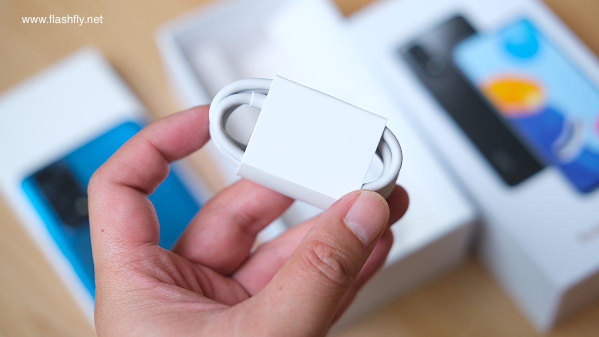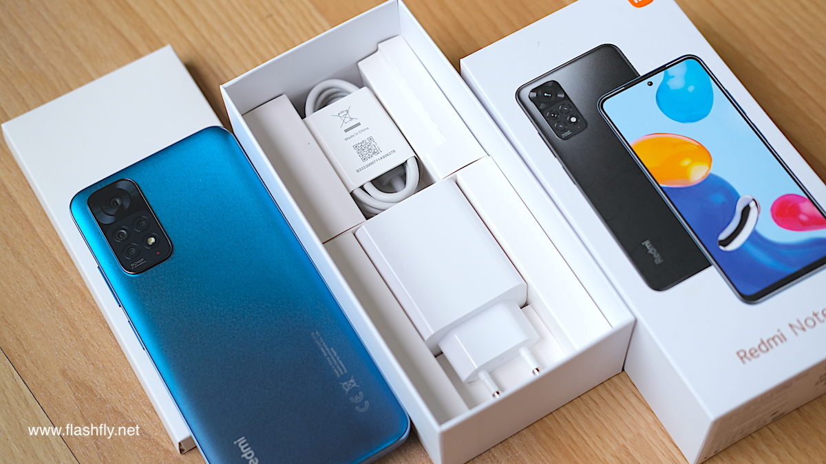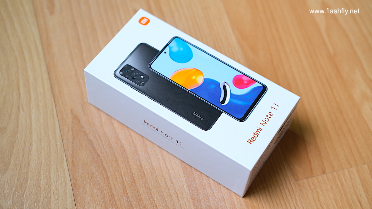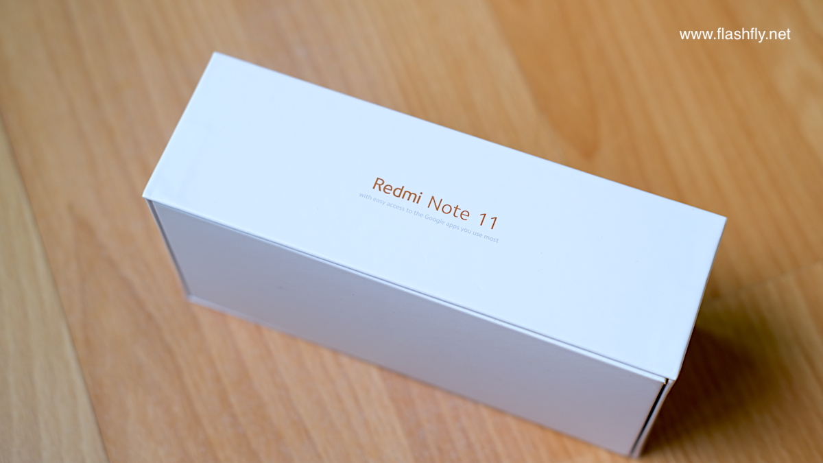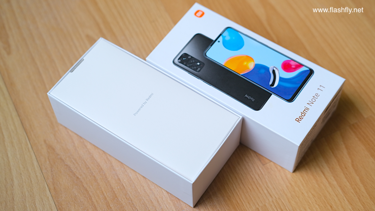 Redmi Note 11 ถูกจัดส่งมาในกล่องสีขาว หน้ากล่องพิมพ์รูปภาพสมาร์ทโฟนขนาดใหญ่ เห็นดีไซน์ด้านหน้าชัดเจน วางทับด้านหลัง ระบุชื่อรุ่นไว้ใต้รูปภาพ และติดโลโก้ Mi ไว้ที่มุมบน