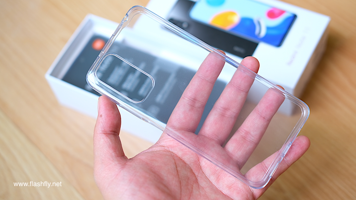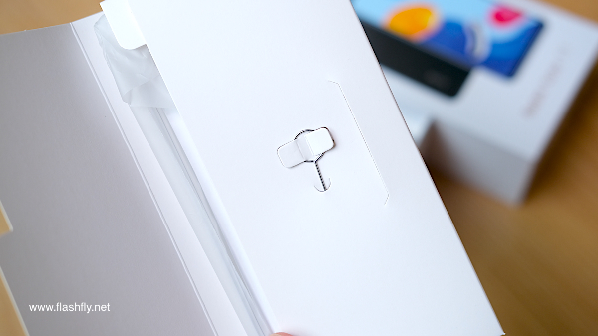 เมื่อยกฝากล่องขึ้นมา จะพบซองเอกสารสีขาว มีข้อความ Powered by Redmi พอแกะซองออกจะเห็นว่ามีเข็มช่วยถอดถาดใส่ซิมการ์ดแนบมาให้ด้วย ภายในมีคู่มือ Quick Start Guide และแถมเคสใสมาให้ 1 อัน