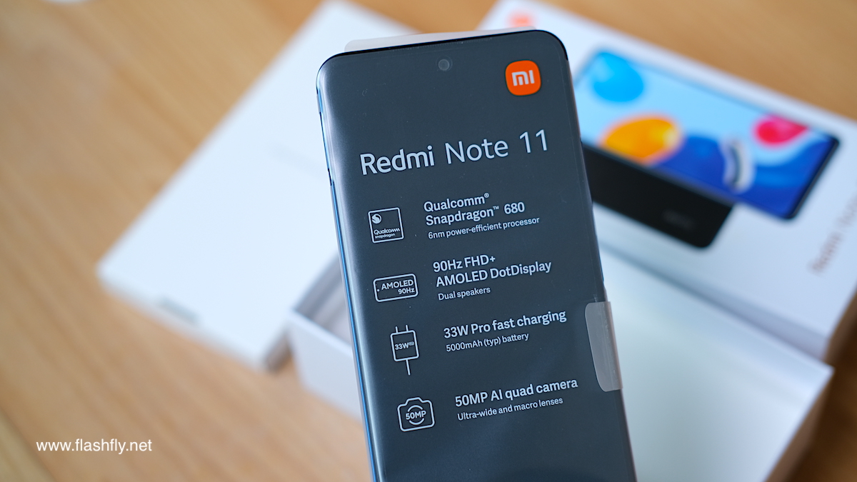 ชั้นถัดมาจะเจอกับสมาร์ทโฟน Redmi Note 11 นอนอยู่ในซองพลาสติก พร้อมบอกจุดเด่นไว้ 4 รายการ ได้แก่ ใช้ชิปประมวลผล Qualcomm Snapdragon 680, จอแสดงผล 90Hz FHD+ AMOLED พร้อมลำโพงคู่, แบตเตอรี่ 5000mAh รองรับชาร์จเร็ว 33W และ ระบบกล้องหลัง 4 ตัว 50MP AI Quad Camera